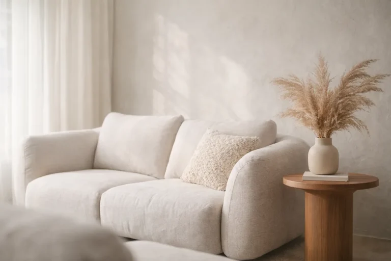 Sofá em linho off-white com formas arredondadas, arranjo de capim seco e madeira natural: a paleta Cloud Dancer na prática...
